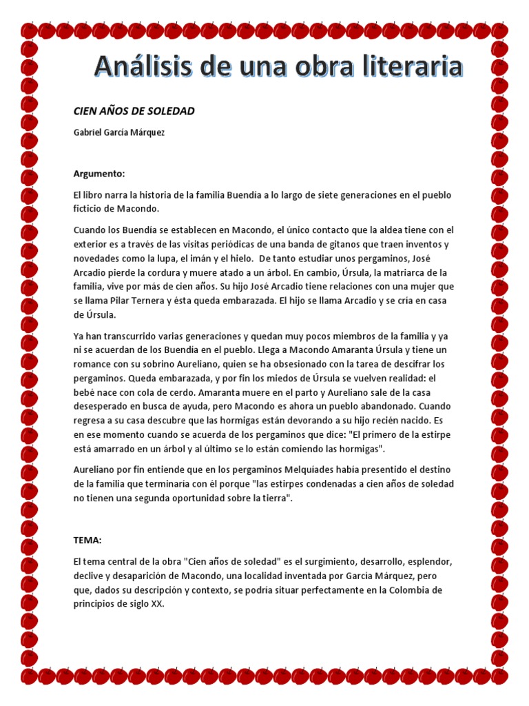 Cien aos de soledad es la obra maestra de Garca Mrquez y fue escrita en. En Cien años de soledad vemos claramente la realidad de las familias las comunidades y finalmente los conflictos mundiales. Análisis del libro Cien Años de Soledad.
